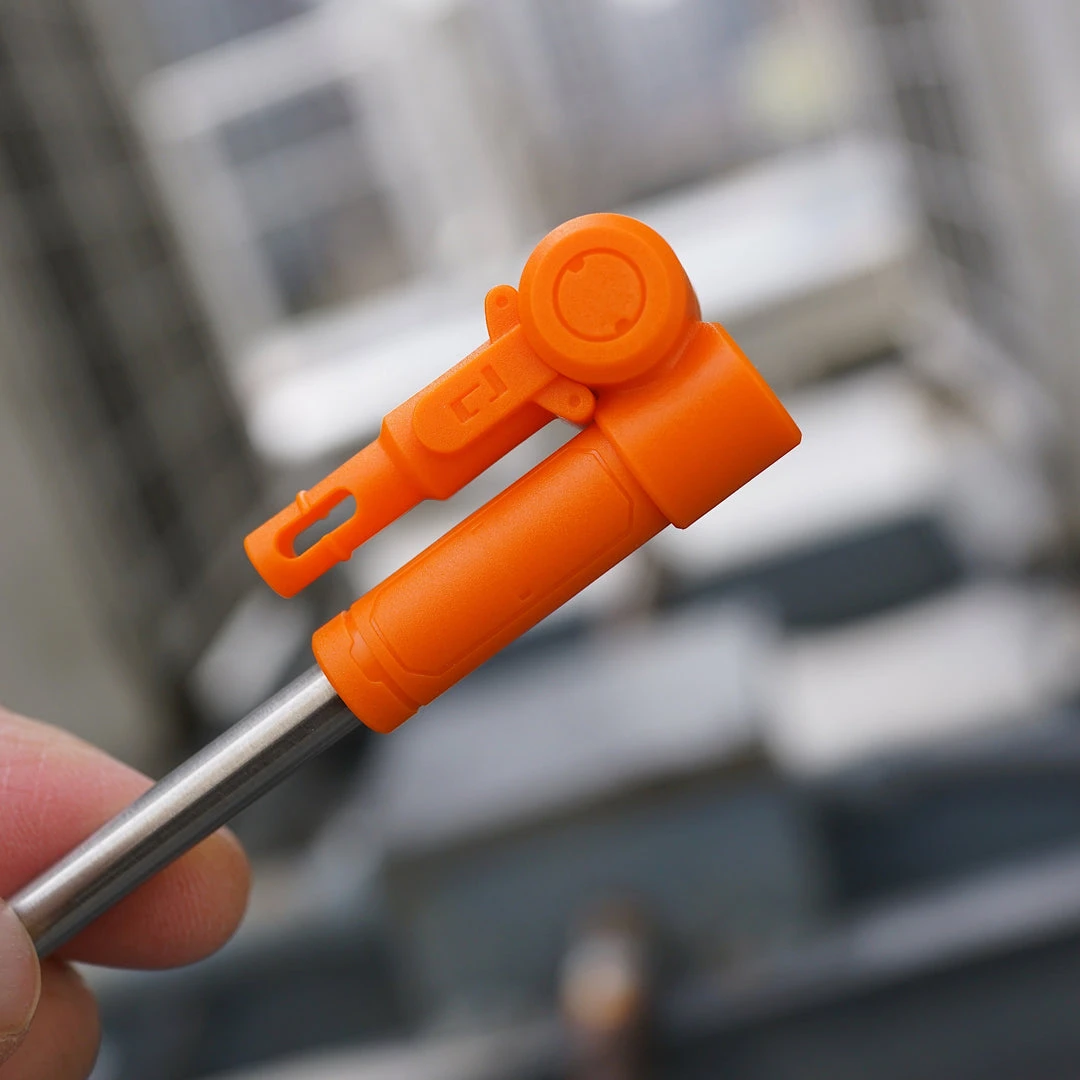 The Swingy Clickety-Click Stand can not only swing left and right, up and down, but can also retract to fold by the thigh when not in use.